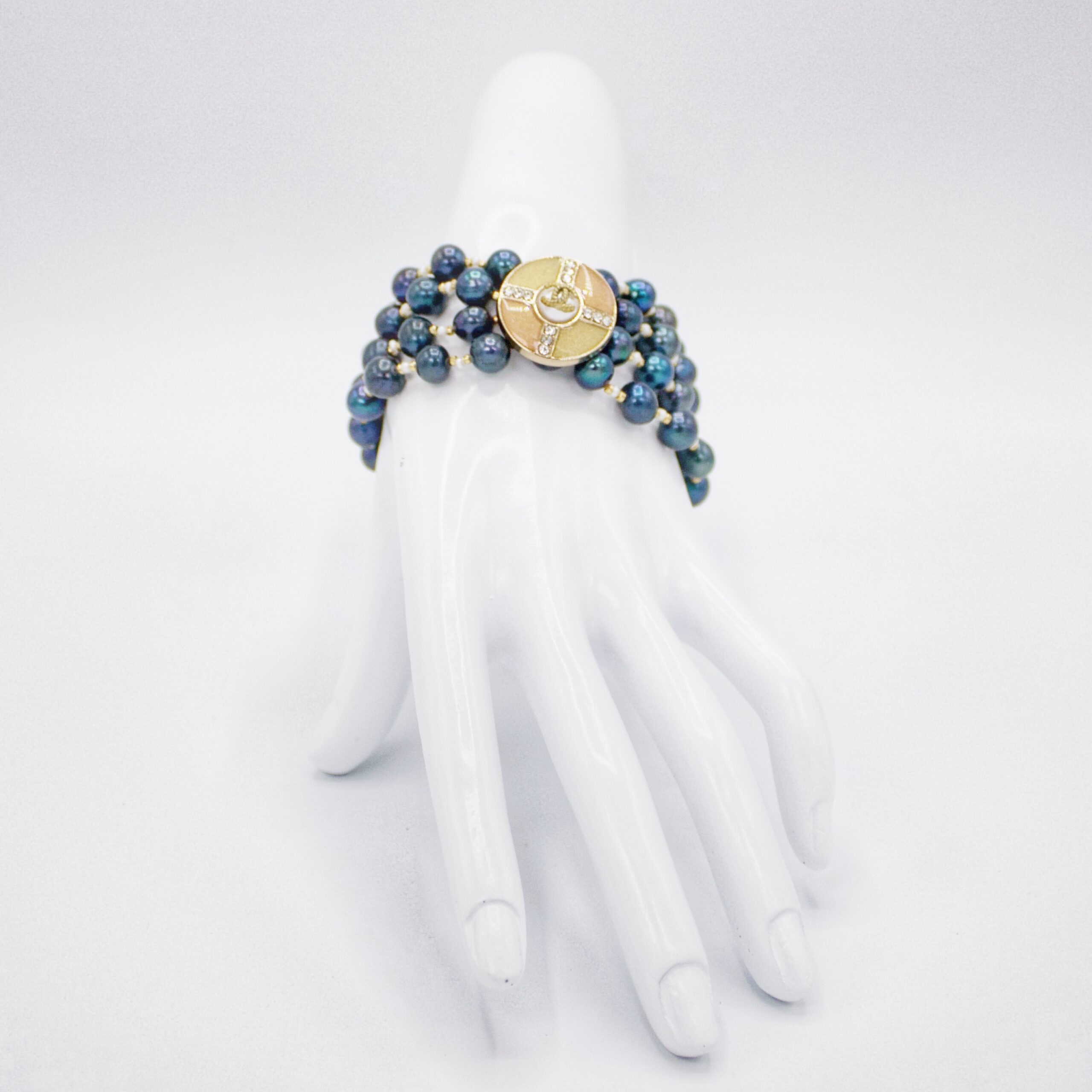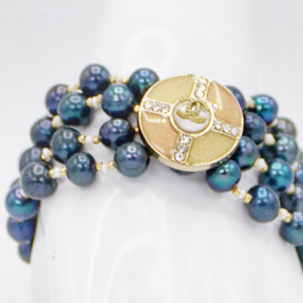 The Hélène Black Pearl Bracelet features quadruple strands of rich, lustrous black pearls, elegantly draping around the wrist. The centerpiece is a stunning vintage button, adding a unique, timeless charm to this sophisticated piece. Perfect for special occasions or to elevate everyday wear, this bracelet embodies classic luxury and refined elegance.