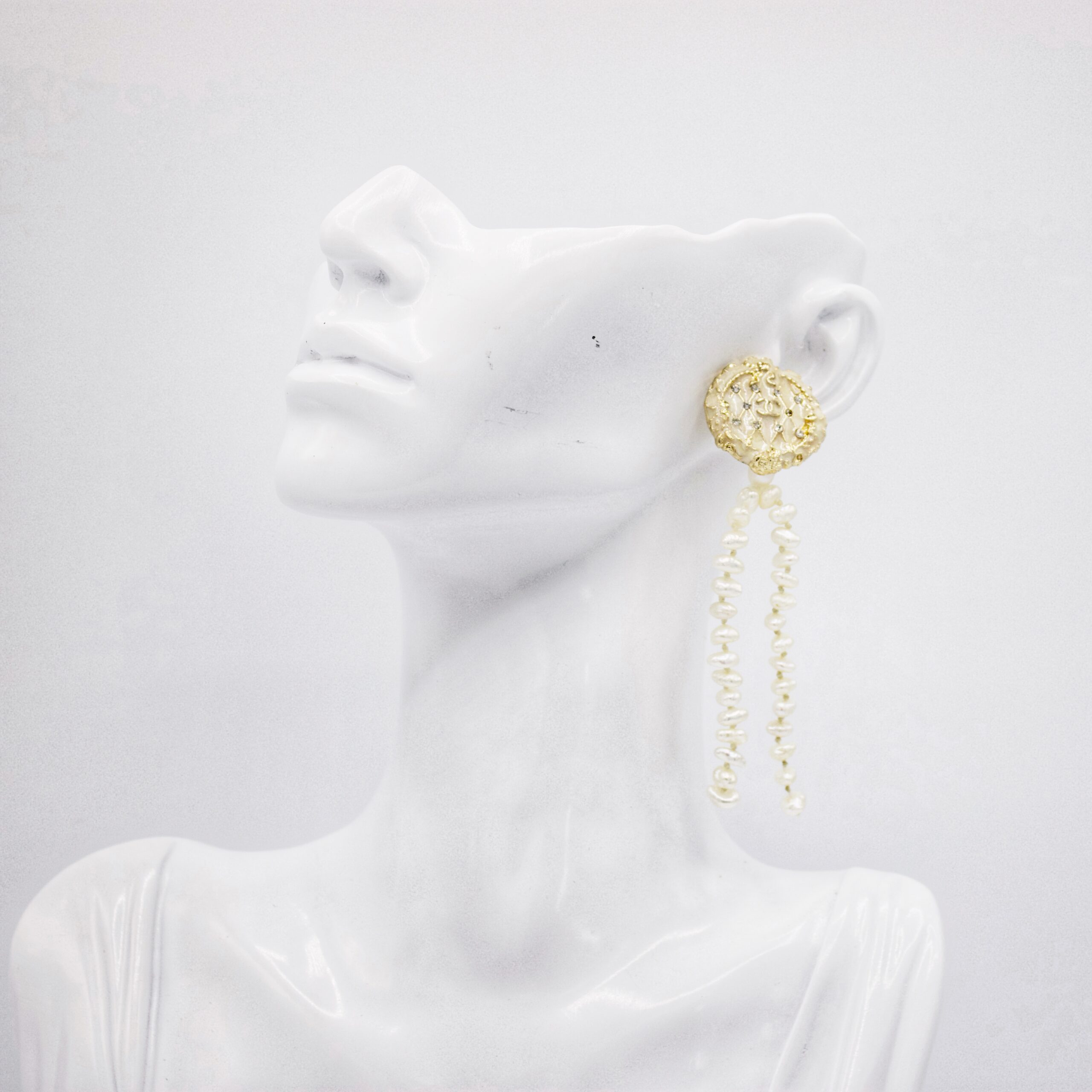 Léonie brings drama and sophistication with cascading pearl tassels flowing from a vintage fashion button. Each strand is composed of small-to-medium pearls for elegant movement and texture. A striking statement earring that channels vintage glamour with a modern edge.