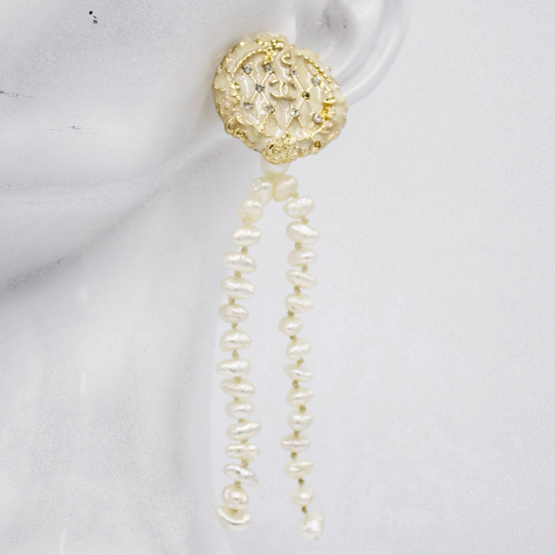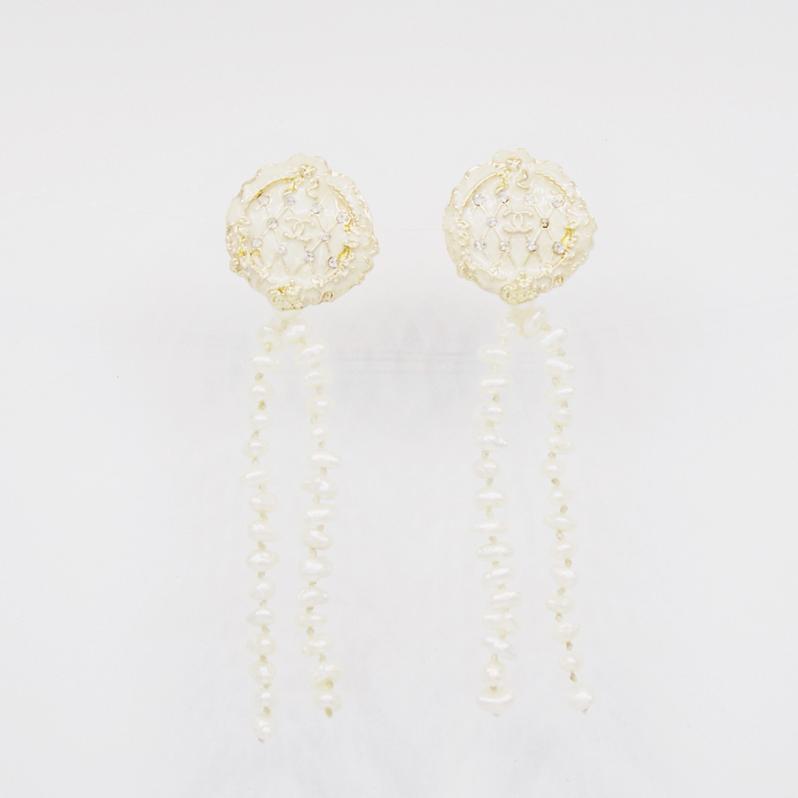 An elongated, dramatic version of Geneviève. Features long pearl tassels (2.5″) cascading from a vintage fashion button.